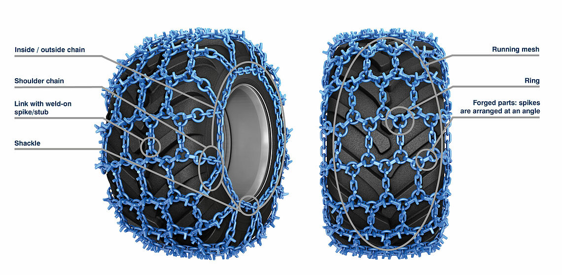 Optimised fit of the chain on the tire – Innovative adjustable elements make fitting the chain on the tire quick and easy. With the spare parts that come with the chains, easy repair works may be completed on site, eliminating the need for machine downtimes. A tensioning chain is optional for pewag forestry chains, but not mandatory.